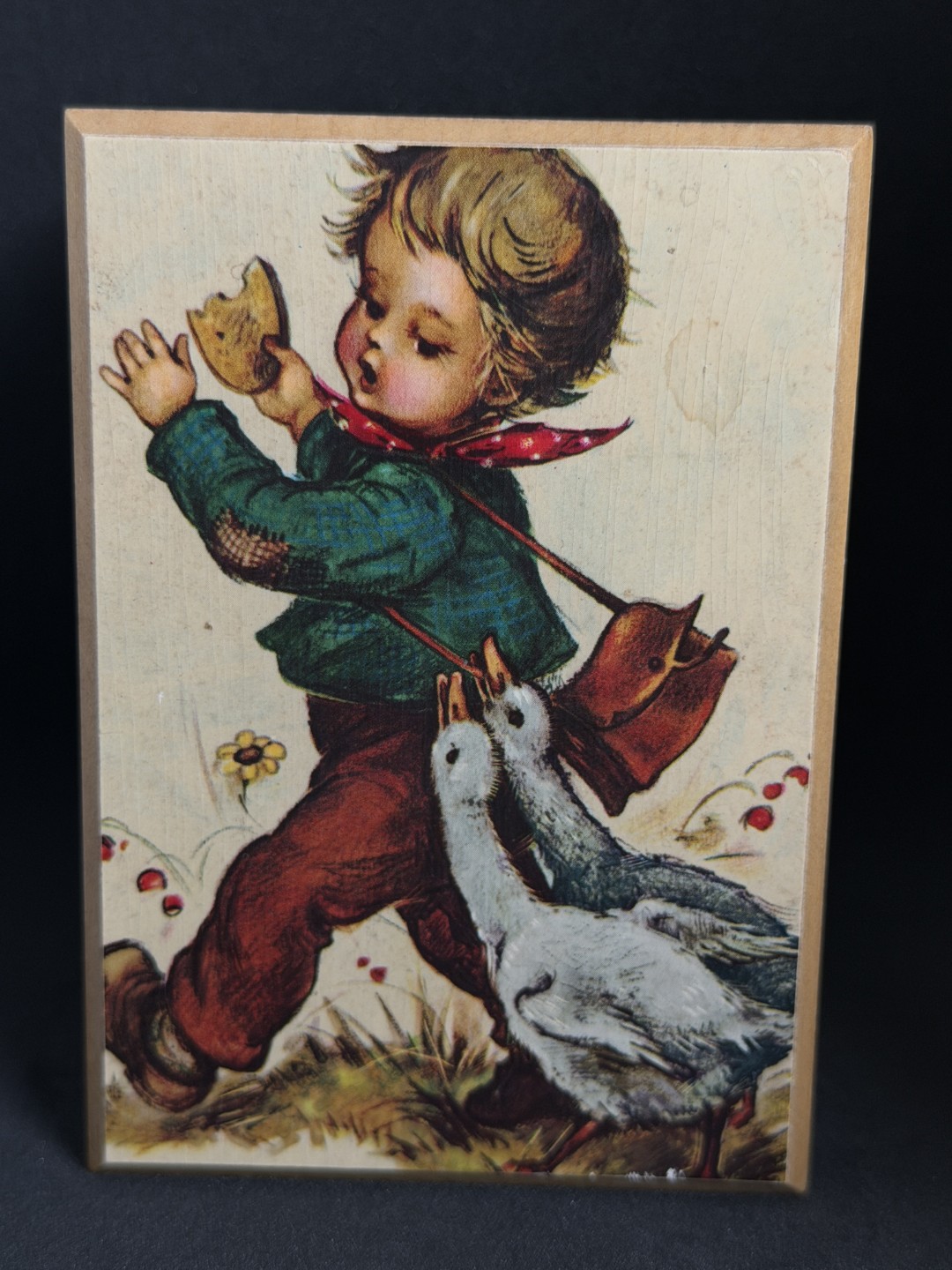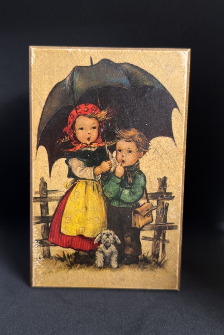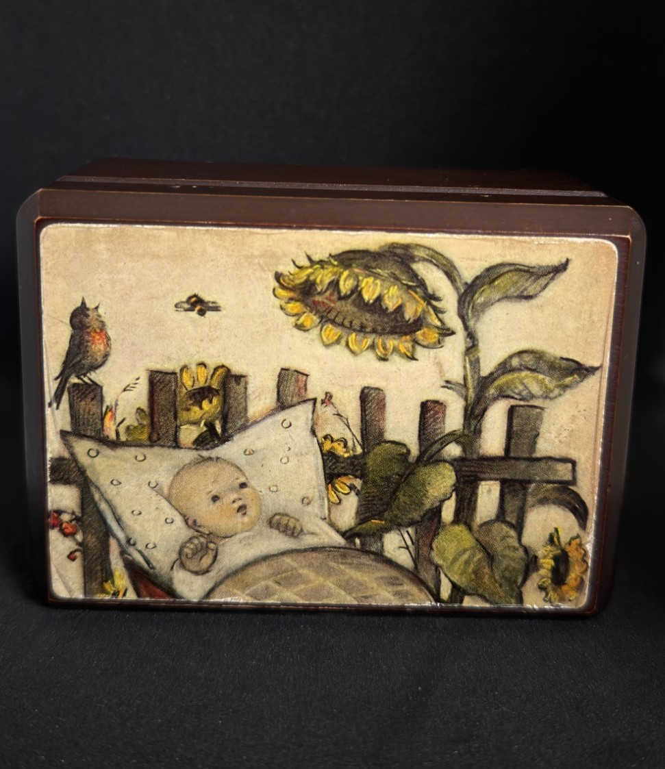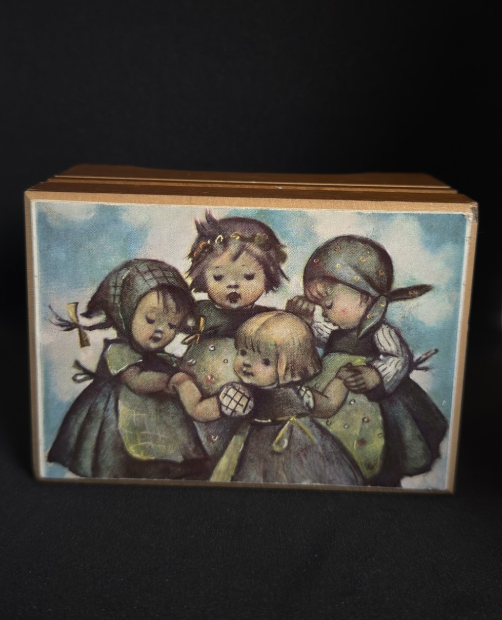 This vintage wooden music box features a classic M.I. Hummel “Rock‑A‑Bye…