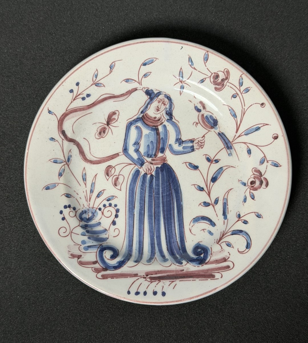 A decorative ceramic plate featuring a robed figure holding a bird,…