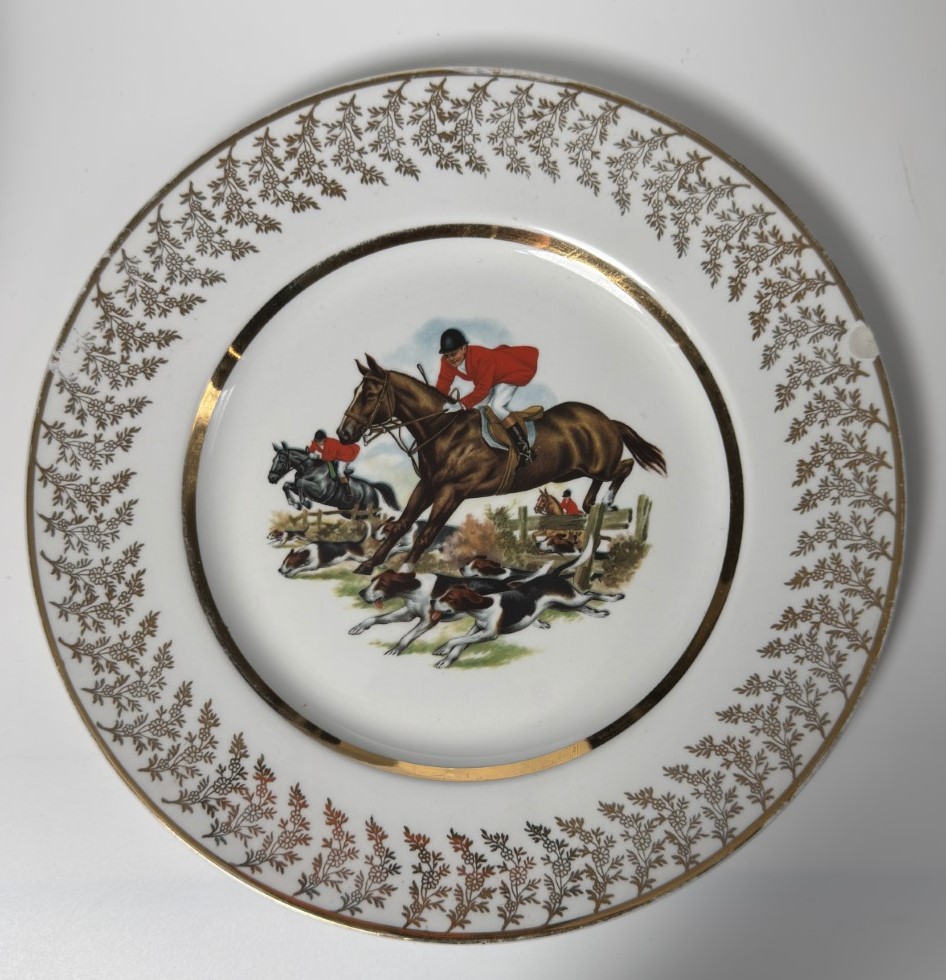 A decorative porcelain plate featuring a rider in a red hunting…