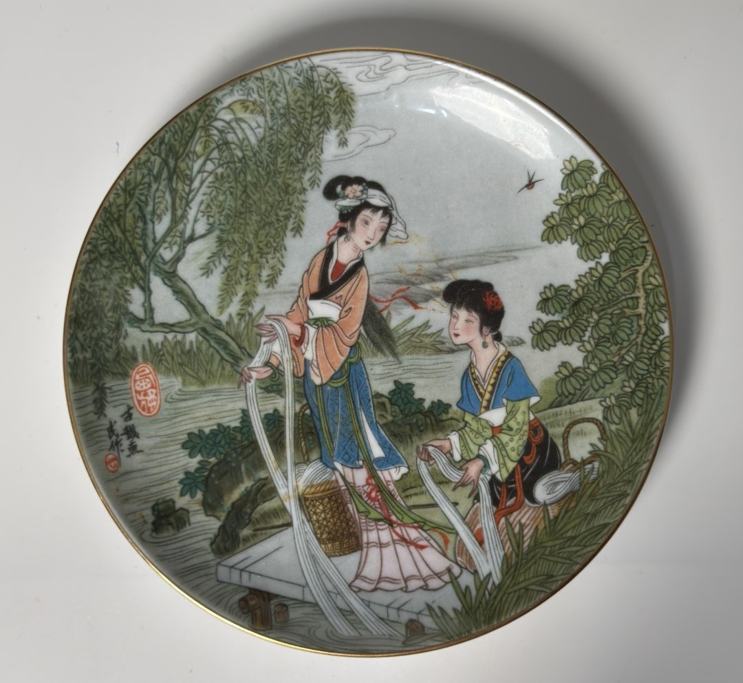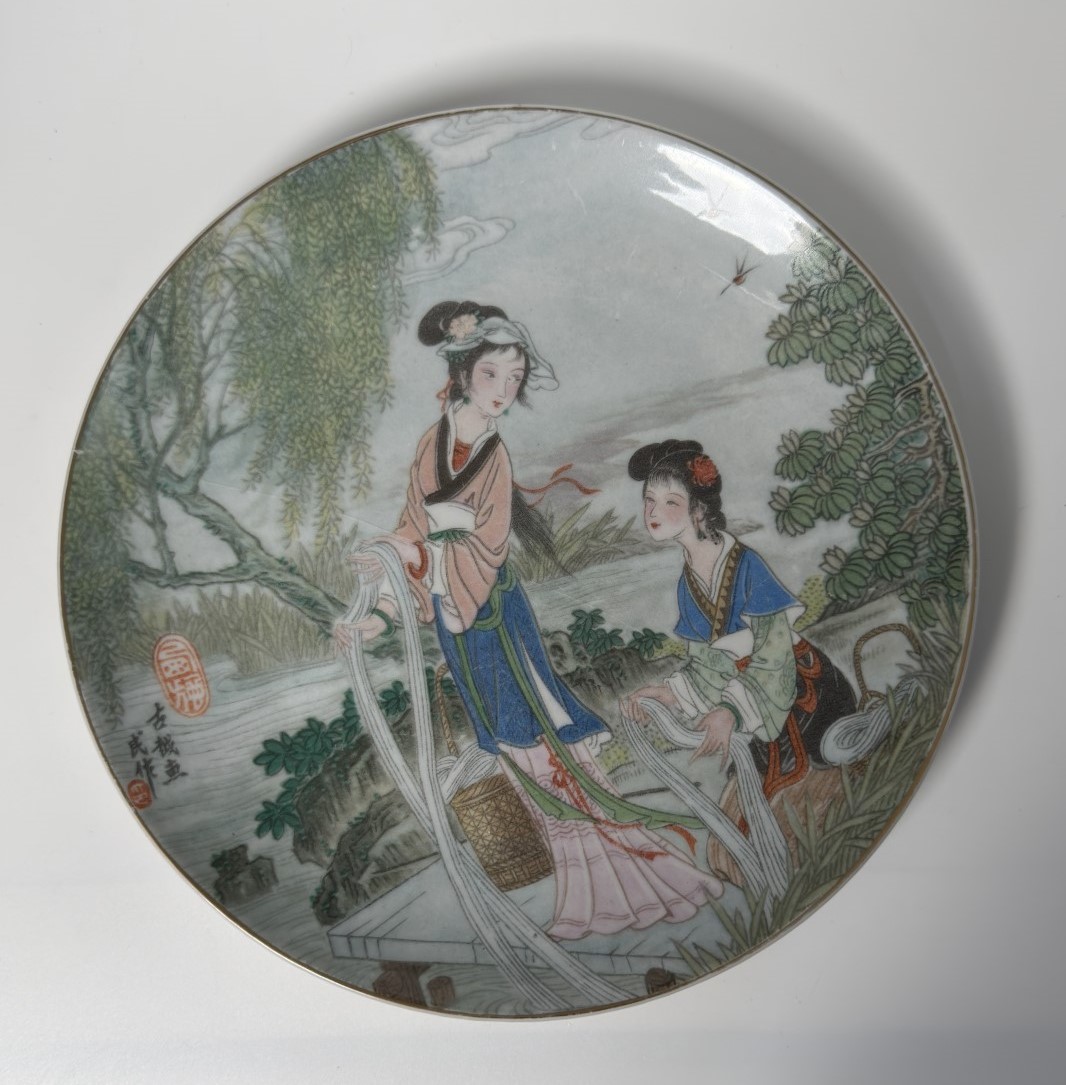 A decorative porcelain plate depicting two women by a riverside preparing…