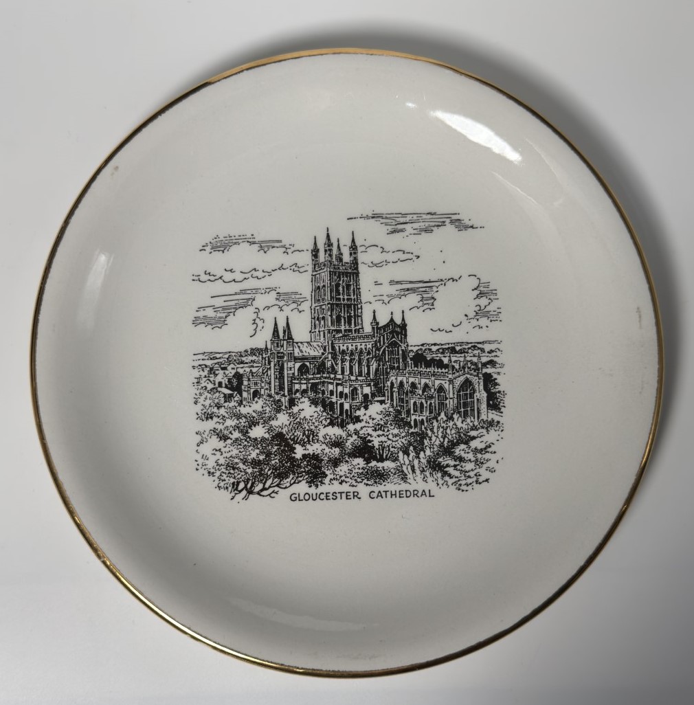 A ceramic plate featuring a black illustration of Gloucester Cathedral, framed…