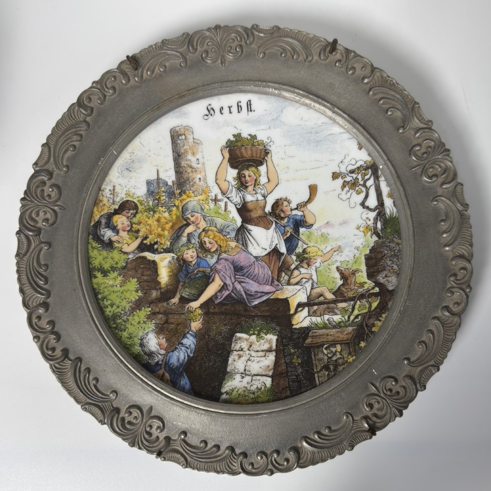 A decorative plate featuring a colorful rural harvest scene labeled “Herbst,”…