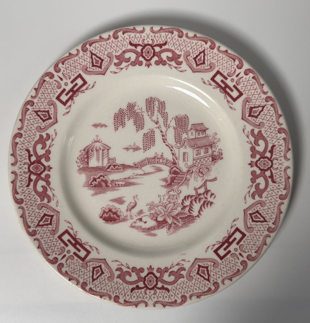 A ceramic plate decorated with a red pastoral scene featuring a…