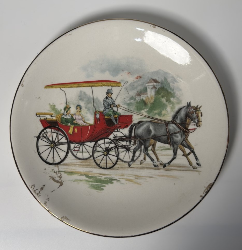 A ceramic plate featuring a colorful scene of a horse‑drawn carriage…