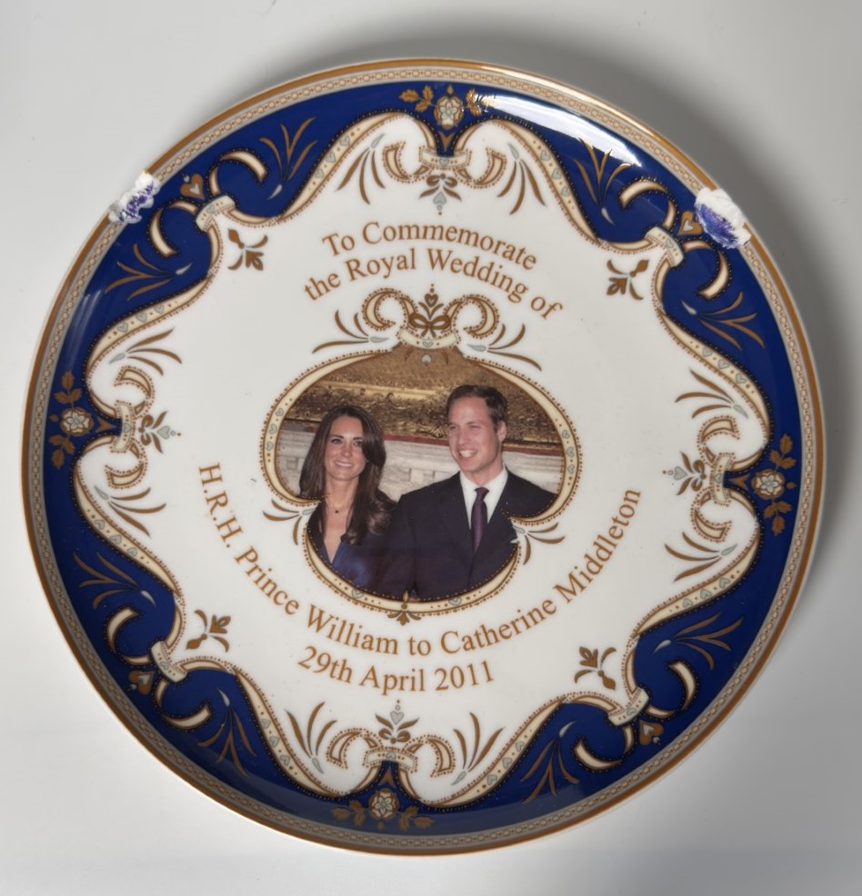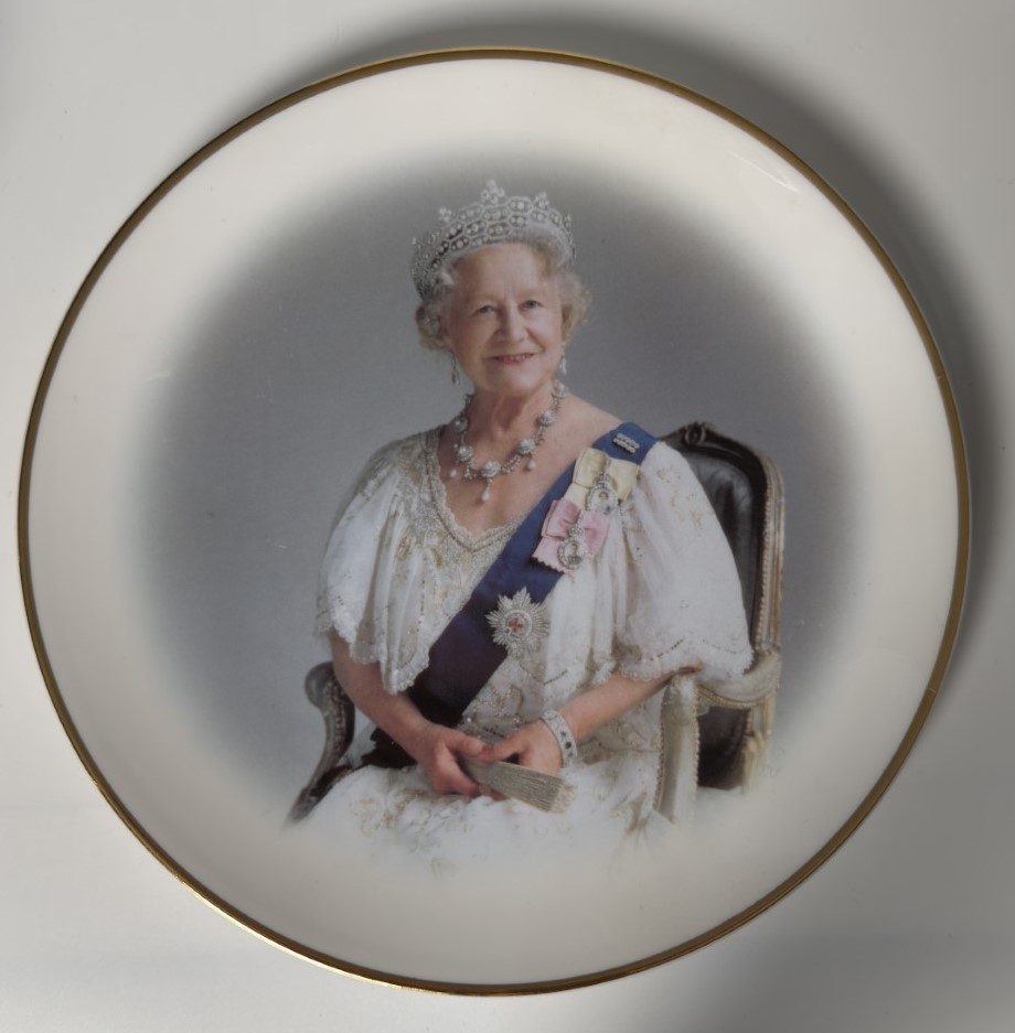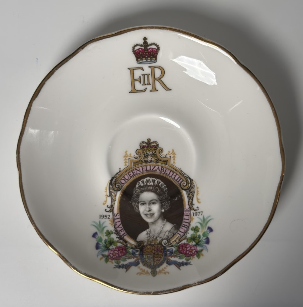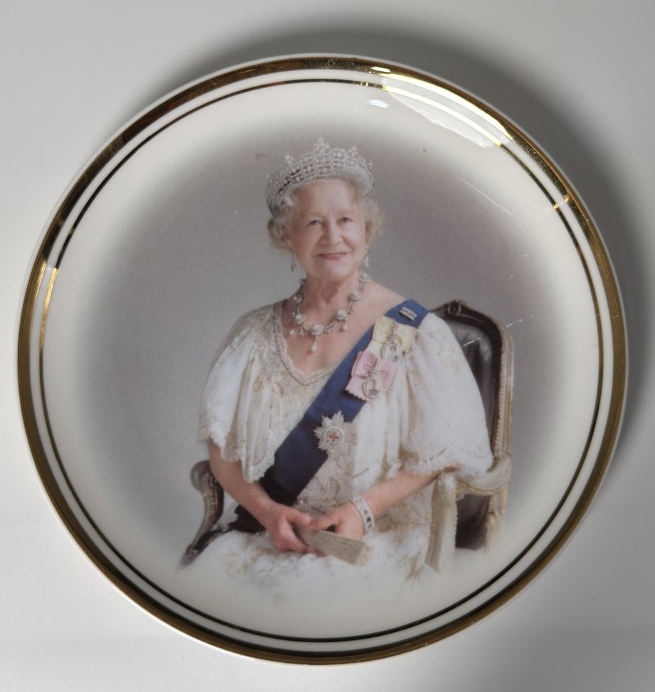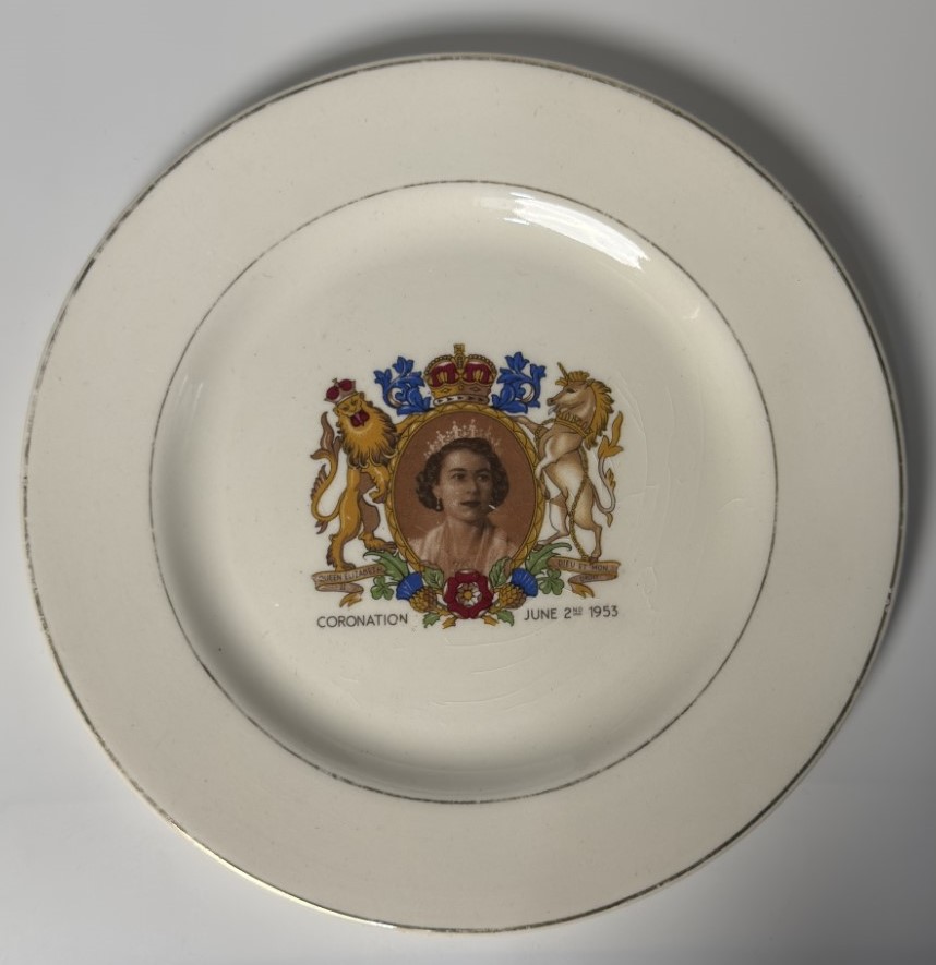 A decorative plate featuring a crowned portrait of Queen Elizabeth II…