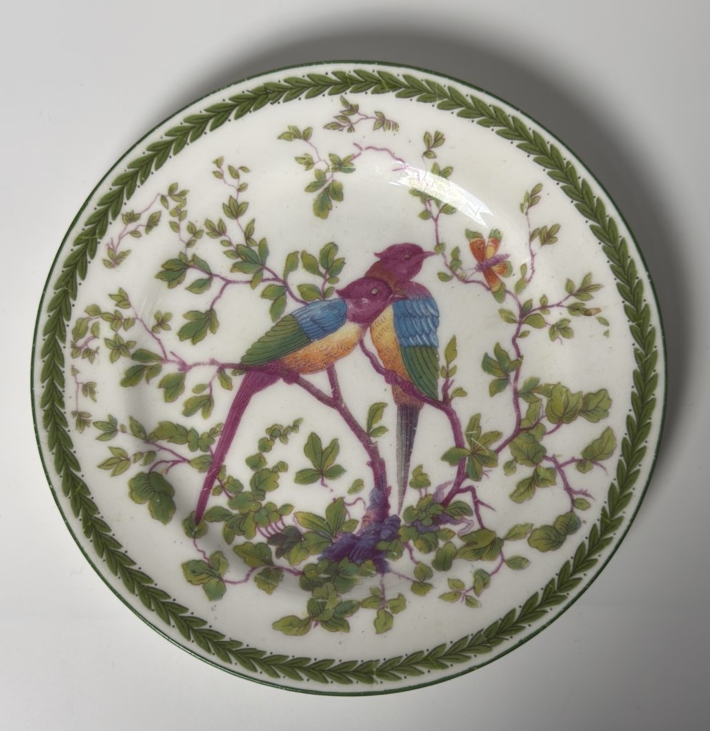 A decorative porcelain plate featuring two vibrantly painted birds perched on…