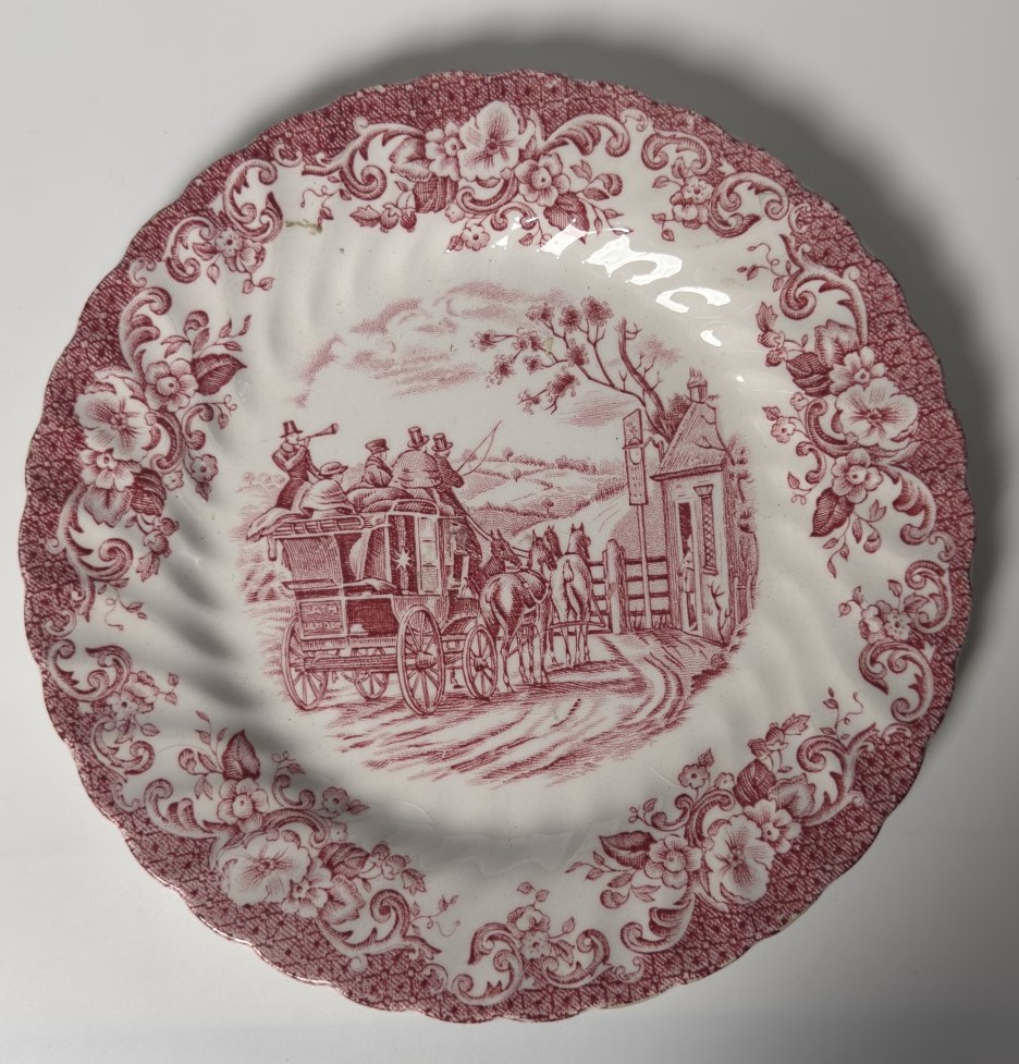 A red‑and‑white transferware plate depicting a horse‑drawn carriage approaching a gatehouse,…
