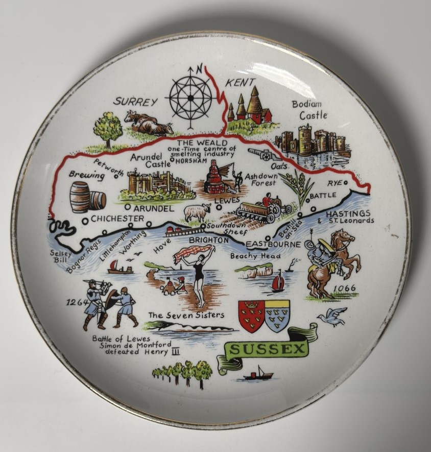 A decorative plate featuring a colorful illustrated map of Sussex, highlighting…