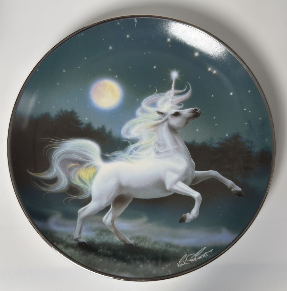 A decorative plate featuring a white unicorn rearing under a starry…
