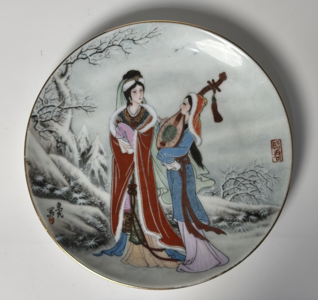 A decorative porcelain plate featuring two figures in traditional East Asian…