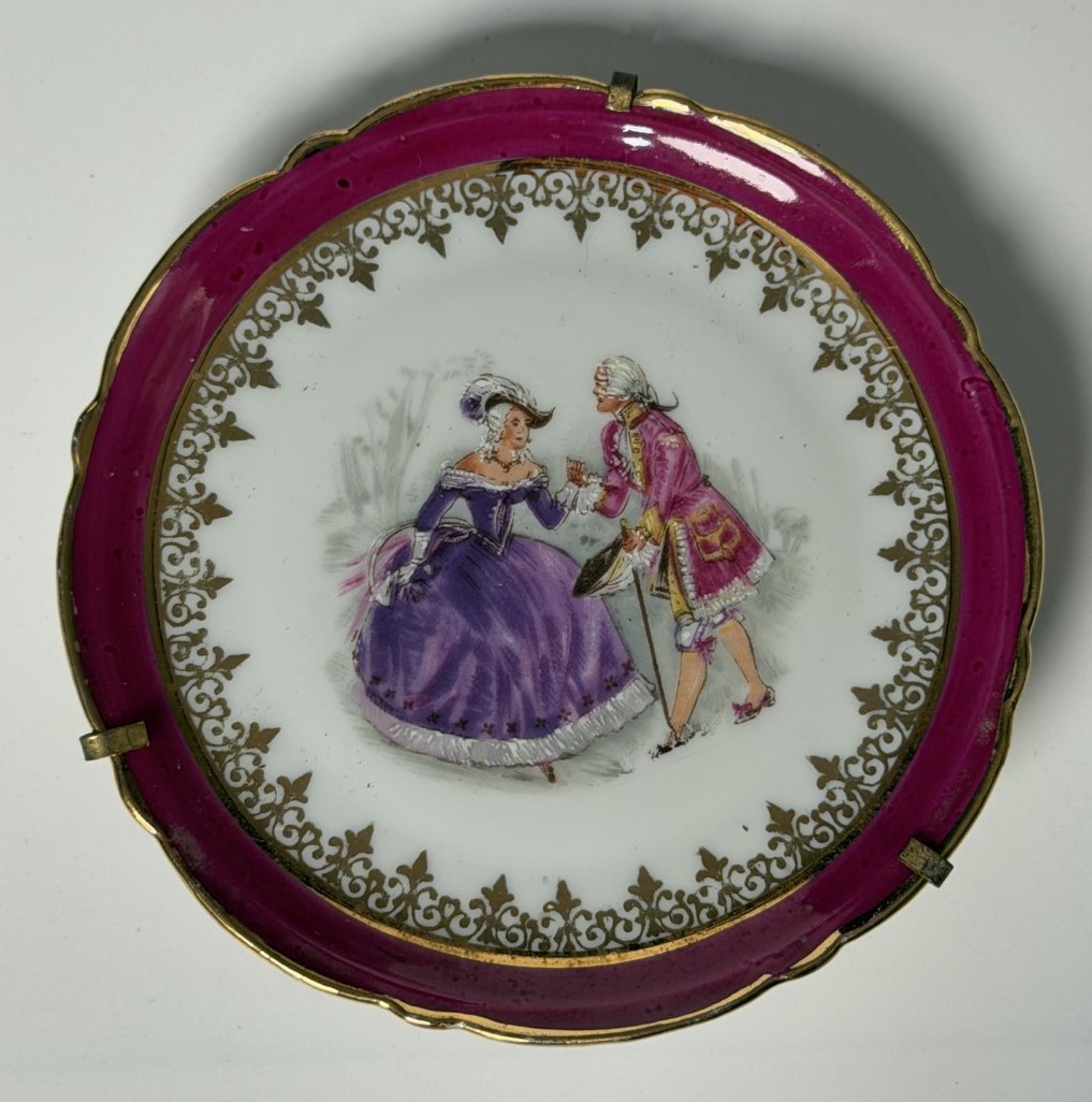 A finely painted porcelain plate depicting two elegantly dressed figures in…