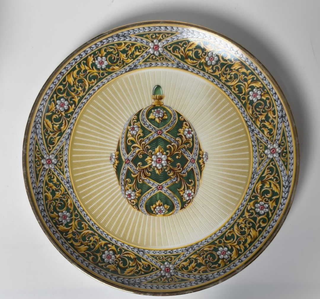 A richly decorated porcelain plate centered on an ornate egg motif…
